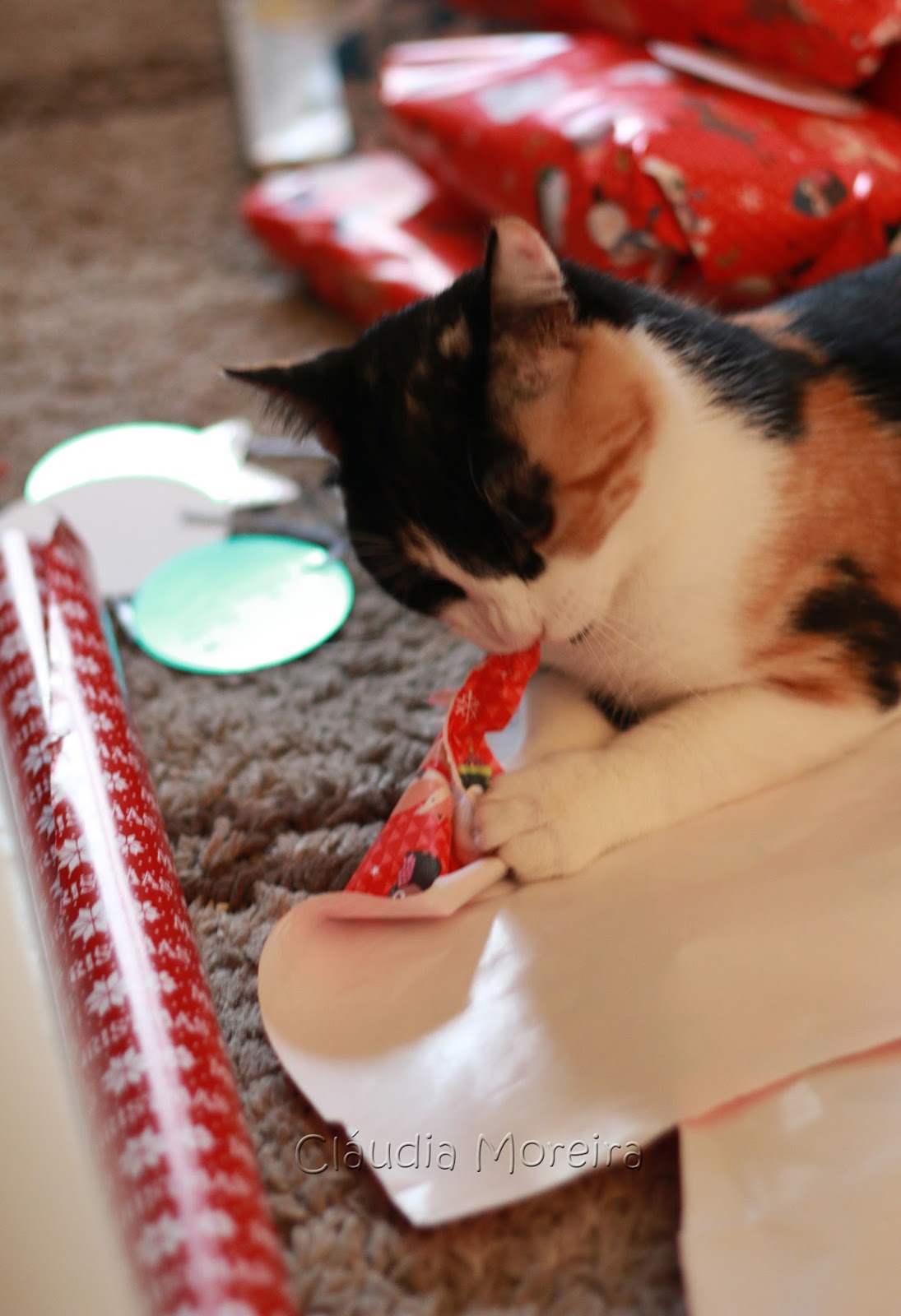 A gata tenta embrulhar-se também e vai rasgando papel.