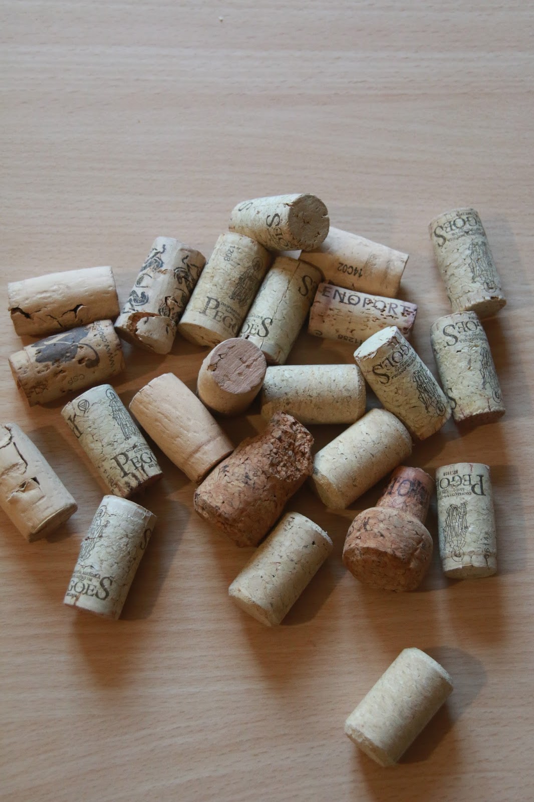 1 - Aproveitar as rolhas que havia por casa. Estas estavam guardadas num frasco, prontas a reciclar. São rolhas que saltaram em festas de aniversário, das garrafas do avô F, de jantares...