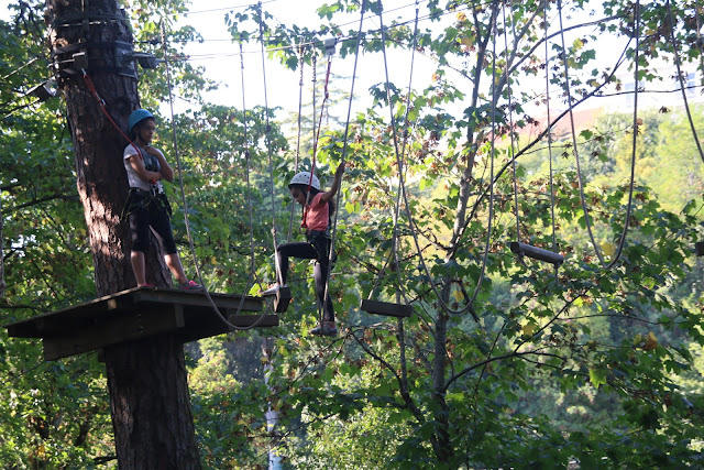 A irmã foi a companhia nas alturas, já que tem bem mais que a altura mínima e para ela não era novidade já que até a festa dos 10 anos da I foi no Skygarden e a R andava ansiosa desde essa altura.... já passaram quase 4 anos! A I teve que ter paciência e repetir os percursos que já conhecia e ir esperando pela irmã ou seguir na frente e ajudar na chegada às plataformas das árvores.