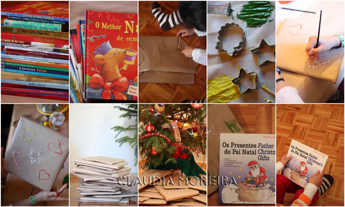 3 - Este ano temos uma novidade, o "Merry reading". Fizemos uma seleção de livros de Natal e outros, num total de 23. Embrulharam, decoraram o papel e para isto descobrimos novo uso para as formas das bolachas e ficaram a secar à espera da hora certa, para serem colocados debaixo da árvore de Natal. Todos os dias, e começou já hoje, tiramos 1 à sorte, e vamos ler no quentinho.
