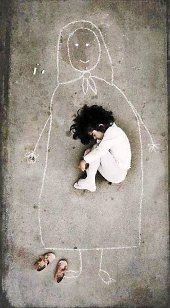 Uma criança num orfanato, com saudades da mãe, desenha-a no chão.