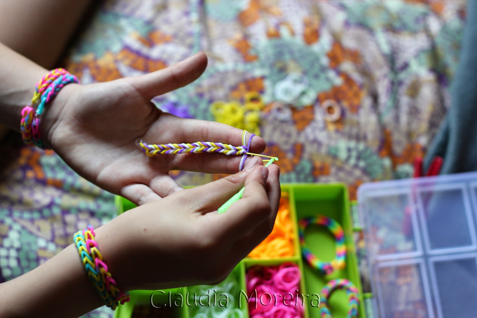 E com uns simples elásticos coloridos lá fazem ponto inglês (sim aquele das camisolas!), pulseiras simples, quadradas e por aí fora!