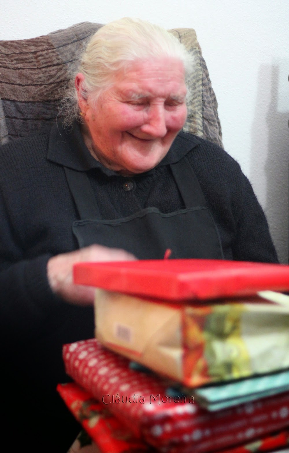 Vi-a chorar de tanto rir. Da felicidade, da companhia, dos embrulhos de papel colorido, da festa que fazem as crianças.