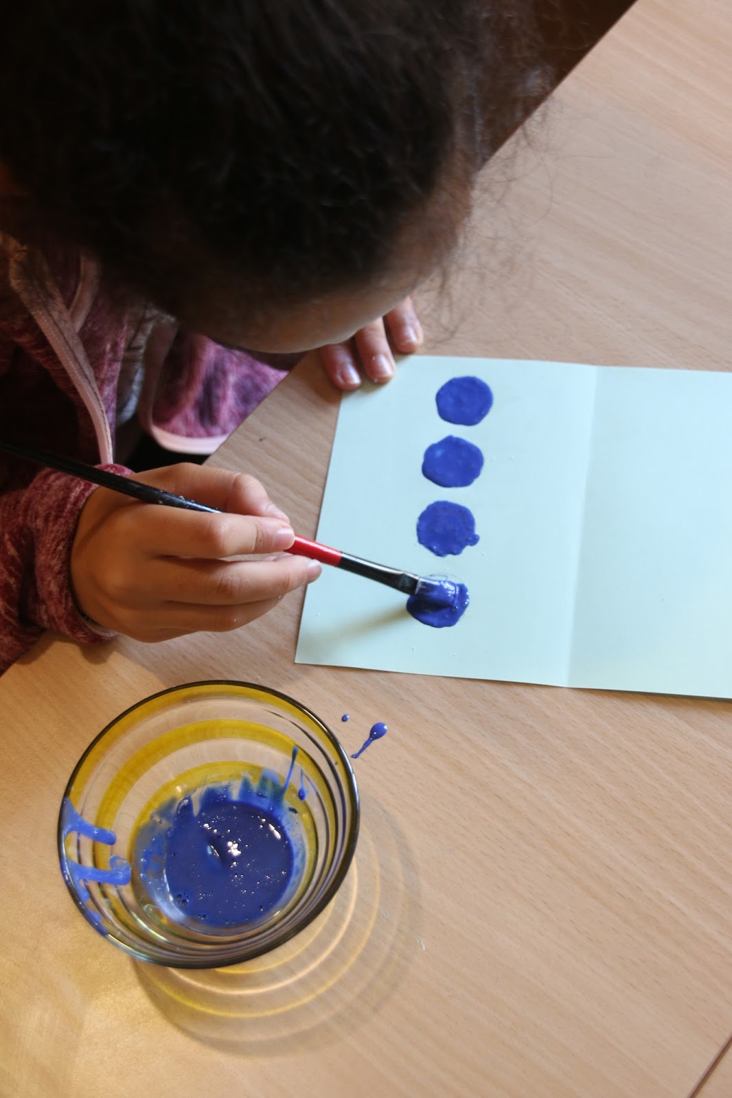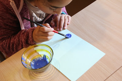 Coloca-se a tinta já misturada com o detergente de modo a pintar toda a área do círculo, e de forma a tapar a palavra lá escrita. Fazem-se quantos círculos quiserem. A R ficou logo aflita porque um já não estava redondinho, outro saiu por fora...